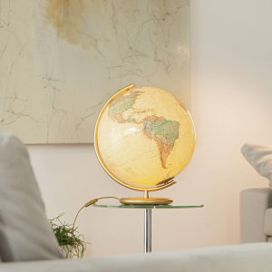This 40cm (16") diameter illuminated globe is larger than the standard size for desktop globes. Each globe ball is hand blown by German craftsmen from the finest glass and the gores (individual sections of the map) are hand-laid. The cartographic artistry of the map, with its unique use of shading on land masses and in the oceans to create a 3-dimensional relief effect, is second to none. The globe shows political features of the earth when unlit and physical features appear when the globe is illuminated. The stand on the Duo Glass globe is made from steel and is deliberately kept simple in design so as not to detract from the globe itself.