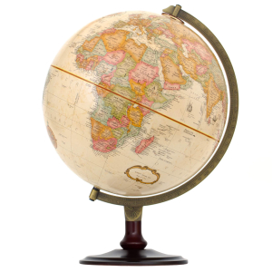 Beautiful form. The Vienna desktop world globe has a style and elegance all its own. It has a 12" (30cm) diameter antique globe ball that is made using traditional techniques and features the popular raised relief, revealing the world's main mountain ranges in a tactile way. It has an up to date map with over 4,000 place names and pieces of information. The cartographer has included illustrations of historical vessels, together with names of explorers, the routes taken and the dates to add further interest to this beautiful globe. The combination of an antique brass-plated, calibrated semi-meridian, mounted atop an antique brass plated base ensures the enduring appeal of the Vienna globe. It adds character in all room environments so is a safe choice that removes any need to match wood finishes.